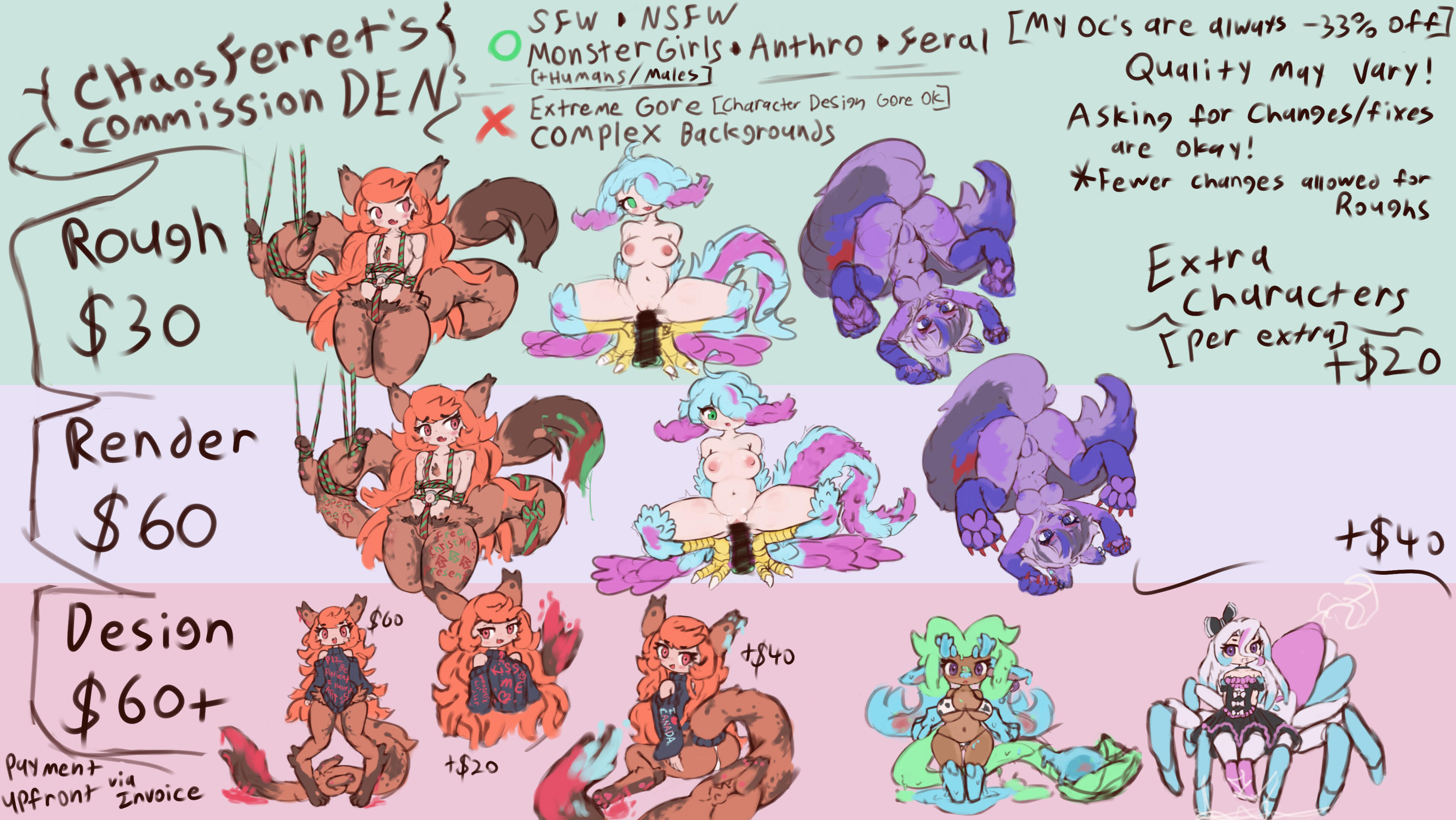 Add-ons:Extra Character(s) +$20 Rough // +$40 RenderExtra Alt, Objects, or Fetishes: $5-10 depending on complexity. (Simpler things may be free)